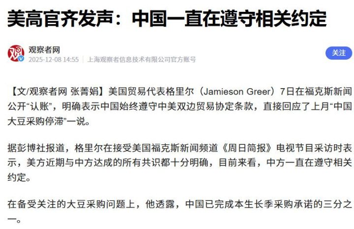 美国贸易代表格里尔7日时,公开明确表示,中国始终遵守中美双边贸易协定条款,直接回应了上月“中国大豆采购停滞”一说。