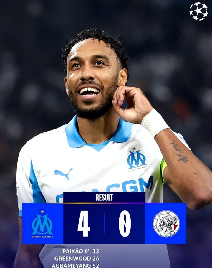 凭借派尚,格林伍德和奥巴梅杨的进球,马赛主场4球完胜阿贾克斯取得了本场的最终胜利!