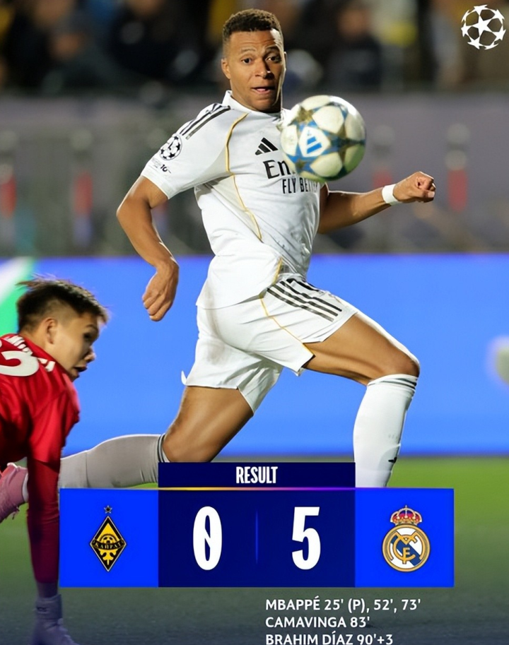 在本场比赛中,姆巴佩成为了皇马远征哈萨克斯坦的取胜最大功臣--凭借法国球星的帽子戏法和卡马文加以及迪亚斯的进球,皇马在客场5球大战欧冠新军,拿到了本赛季的欧冠两连胜!