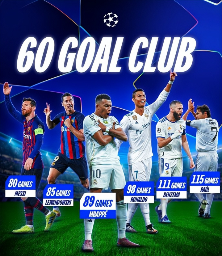 最后,打进了个人在欧冠生涯60粒进球的姆巴佩,也以89场60球的效率位列历史第三,仅次于梅西(80场)和莱万的(85场)。