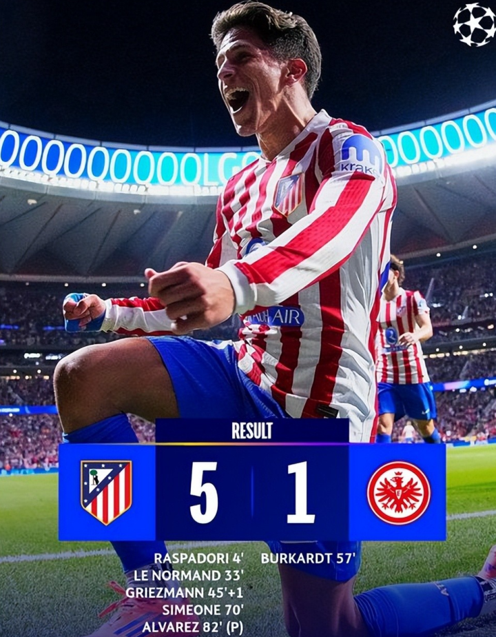 继上周的马德里德比5-2的比分击溃了皇马之后,马竞的状态看上去得到了延续--在主场对阵法兰克福的比赛中,凭借格列兹曼,阿尔瓦雷斯等5位球员的进球,马竞主场5-1大胜法兰克福最终拿到了本赛季欧冠的首胜。
