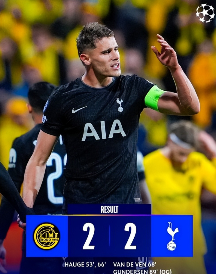 当海于格在下半场的13分钟之内梅开二度之际,所有人或许都以为博德闪耀能在主场击退上赛季的欧联冠军从而拿到一场胜利。然而,范德芬的进球和最后时刻甘德森的乌龙,最终让热刺在客场幸运收获了平局的不败结果。